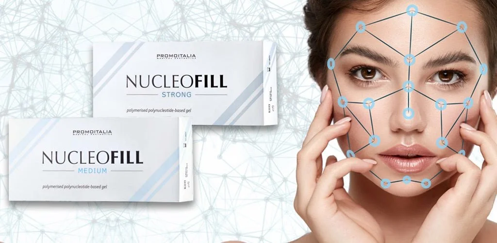 Nucleofill is the new line of natural polynucleotide-based, bio-stimulating gels developed with a high viscosity for protecting and rejuvenating the skin. The Nucelofill product range contains high molecular weight polynucleotide chains. These polynucleotides act on three different levels: lifting, anti-oxidant, and hydrating.